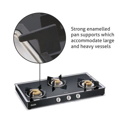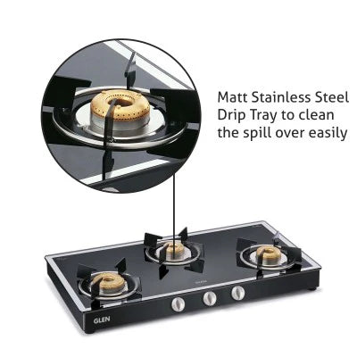 3 Burner Mirror Finish Glass Gas Stove with High Flame Forged Brass Burner Black (1038GT FBM BL) - Manual/Auto Ignition