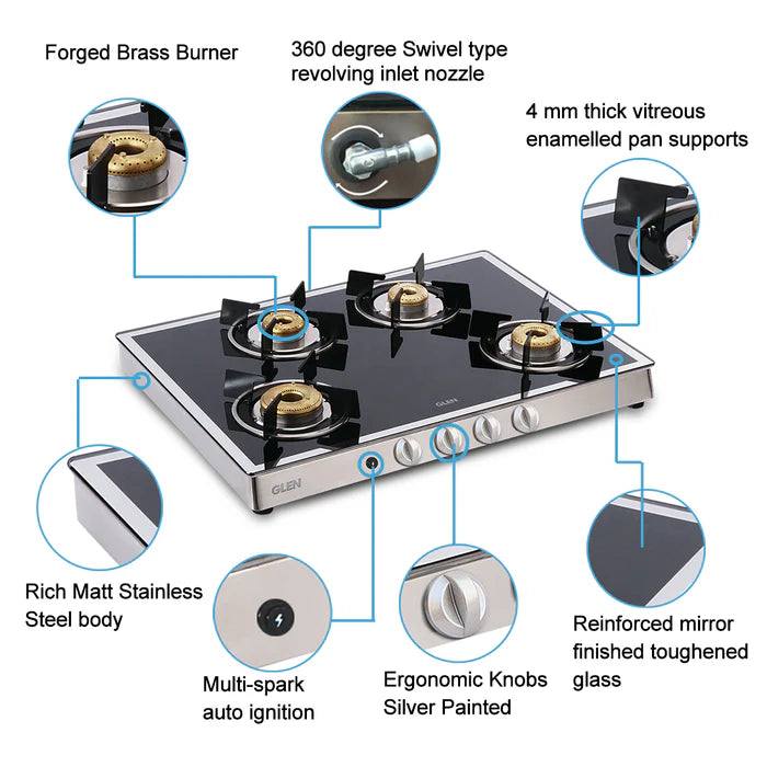 4 Burner Glass Gas Stove Mirror Finish 1 High Flame 3 Forged Brass Burners Auto Ignition 70 CM (1048GT FBMAI)